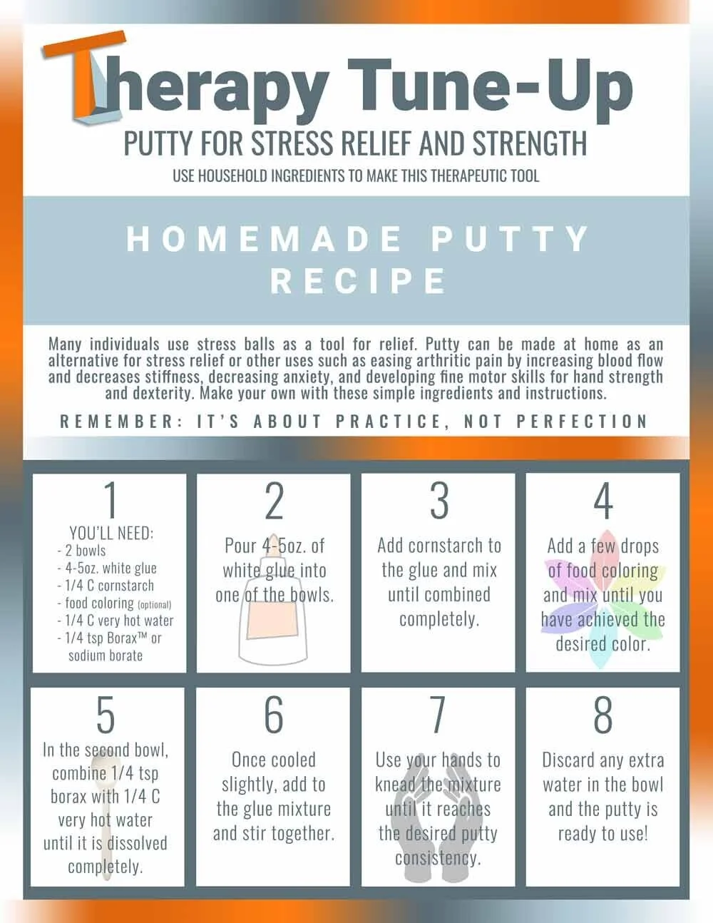 Many individuals use stress balls as a tool for relief. Putty can be made at home as an alternative for stress relief or other uses such as easing arthritic pain by increasing blood flow and decreases stiffness, decreasing anxiety, and developing fine motor skills for hand strength and dexterity. Make your own with these simple ingredients and instructions.